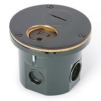 Round, flush installation, drop in floor box with brass, dual flip lid cove
