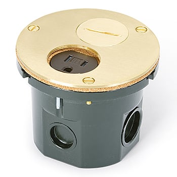 Round, flush installation, drop in floor box with brass, screw plug cover and 15A (TR) duplex outlet (receptacle).