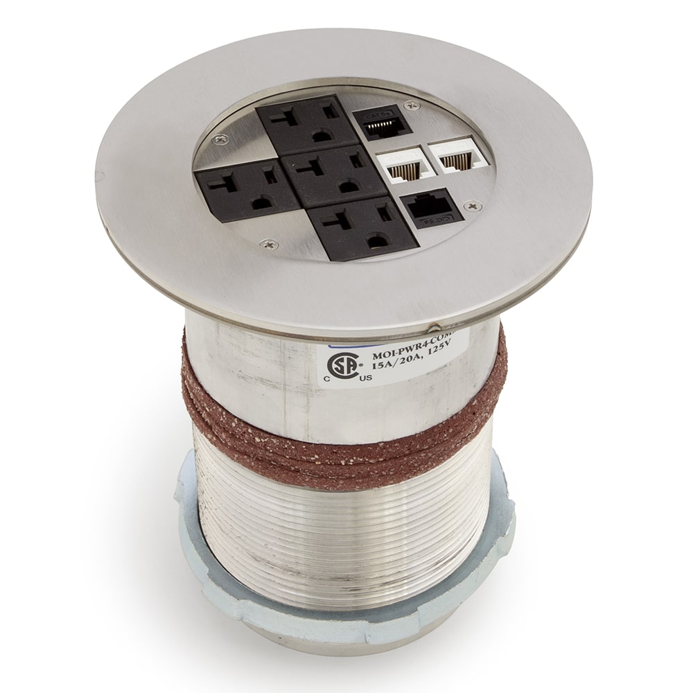 The Lew Electric MOI4 is a four inch core, multi-use, flush to finished floor round poke-through assembly. It provides easy access to power, voice, and data connections in unobstructed flush-to-floor required applications. The attractive appearance and innovative design create option flexibility and functionality and is scrub test rated for any scenario. Using a four inch hole saw makes installation fast and easy. Future removal and reinstallation is easily accomplished if required. The box is UL 2-hour fire rated (concrete depth: 4.5″ minimum), for the USA and Canada and is also CSA approved for Canada.