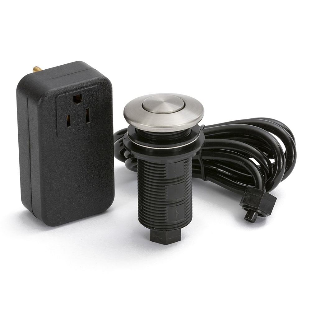 Installation is quick and simple, requiring only a 1 3/8-inch hole in the countertop for the air button. Once inserted, the button is secured underneath using a lock nut. The power controller plugs into any UL-approved three-prong outlet. You then connect the included air tubing from the button to the controller and plug your disposal into the power module. The controller supports garbage disposals rated up to 1 horsepower, making it compatible with most major disposal brands including InSinkErator, Waste King, Moen, GE, KitchenAid, and others.