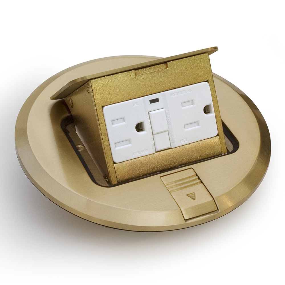 6″ round brass pop-up floor box cover with 15A (TR) GFCI outlet (receptacle).