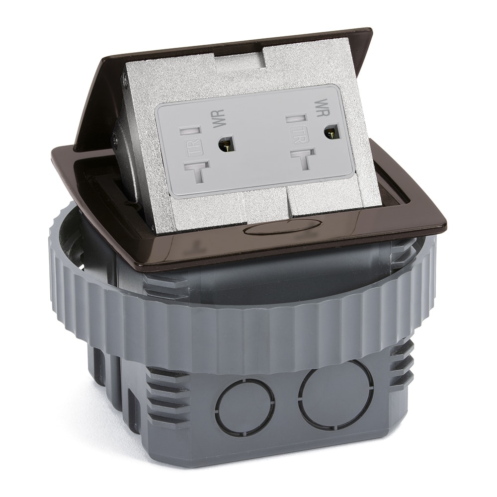 Kitchen counter pop-up power outlet assembly with 20A (TR) Decora outlet (receptacle) – dark bronze metal cover.
