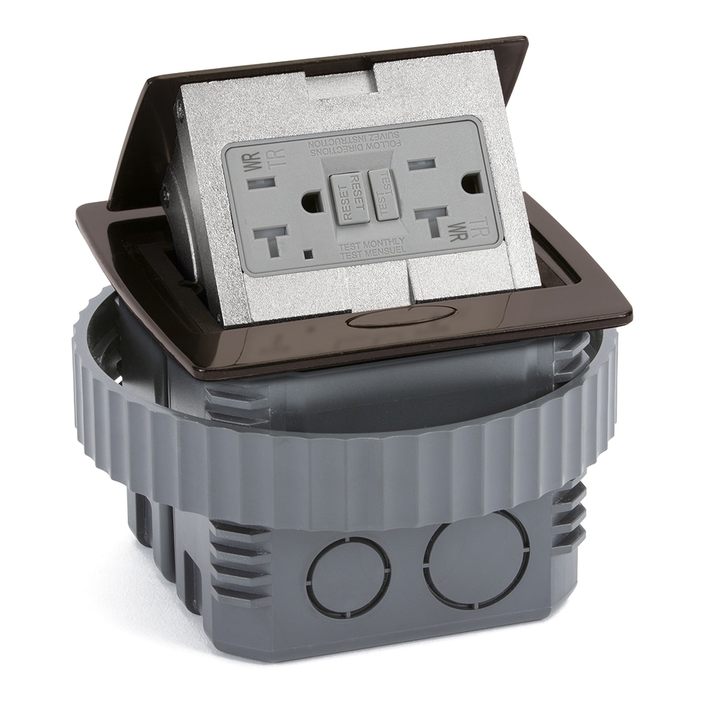 Kitchen counter pop-up power outlet assembly with 20A (TR) GFCI outlet (receptacle) – dark bronze metal cover.