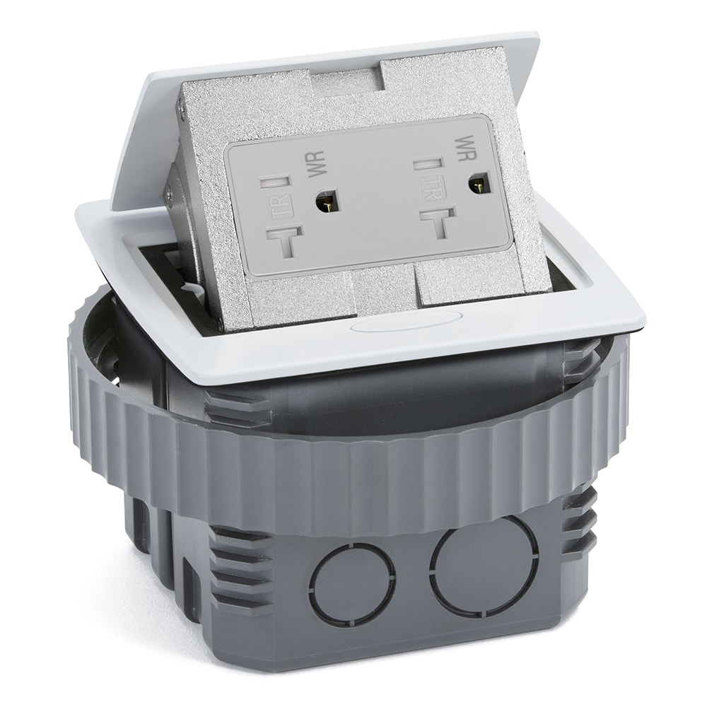 Kitchen counter pop-up power outlet assembly with 20A (TR) Decora outlet (receptacle) – white metal cover.