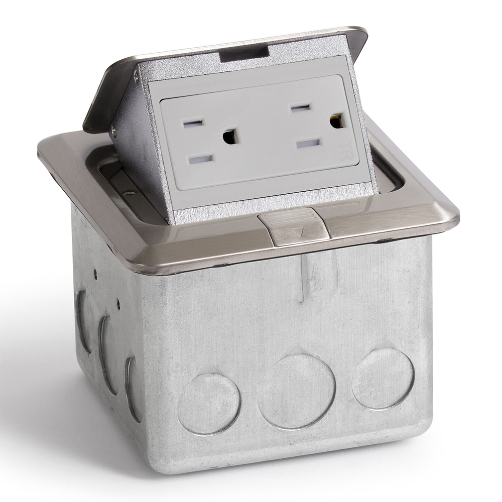 Stainless pop-up floor box with 15A (TR) Decora outlet (receptacle).