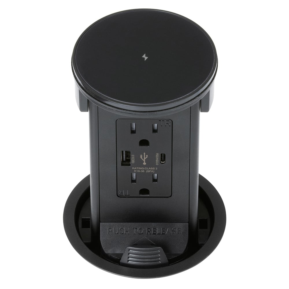 The Lew Electric PUR15ACQD-BK round Kitchen Countertop Pop-Up assembly is a sleek and functional solution for bringing power access directly to your kitchen countertop or any other work surface. Designed to remain hidden when not in use, this retractable in-counter power outlet features a press-and-pull design—simply press the top and lift to reveal the outlet station. When not needed, the unit retracts and disappears completely beneath the counter, preserving a clean and clutter-free surface. The pop up also features a built-in Qi wireless charging, black tempered glass top, allowing you to conveniently charge your smartphone by simply placing it on the surface. This wireless charging station is compatible with all Qi-enabled smartphones, including popular brands like the Apple, Samsung and Google. Whether the outlet is in the open or closed position, the Qi charger remains fully functional, offering seamless integration into your daily kitchen routine without cluttering your countertops.
