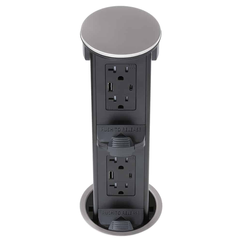 This pop-up power station includes two 20 AMP tamper-resistant receptacles compatible with both 15 AMP and 20 AMP plugs, ensuring it can handle high-powered small kitchen appliances like blenders, coffee makers, toaster ovens, and warming trays without tripping the circuit. The receptacles also feature advanced USB charging ports, including a USB-A port that supports Quick Charge 3.0 and delivers up to 27 watts, and a USB-C port that supports both QC 3.0 and PD 2.0 standards for up to 30 watts of fast charging power. The USB-C port is powerful enough to charge smartphones, tablets, and even laptops, making this outlet a complete power and charging solution for your kitchen or workspace. When both USB ports are in use, the combined output caps at 30 watts, ensuring safe and efficient power distribution.