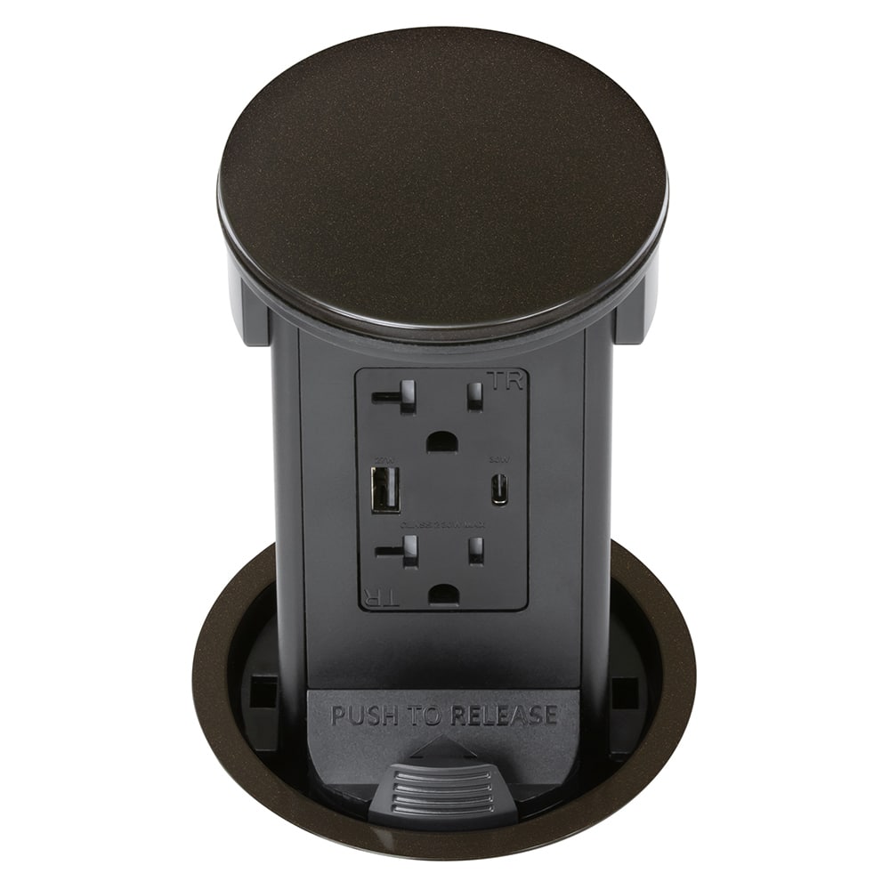 Round kitchen countertop pop-up power assembly with 20A (TR) Decora/ 2USB (AC) outlet (receptacle) – dark bronze metal cover.