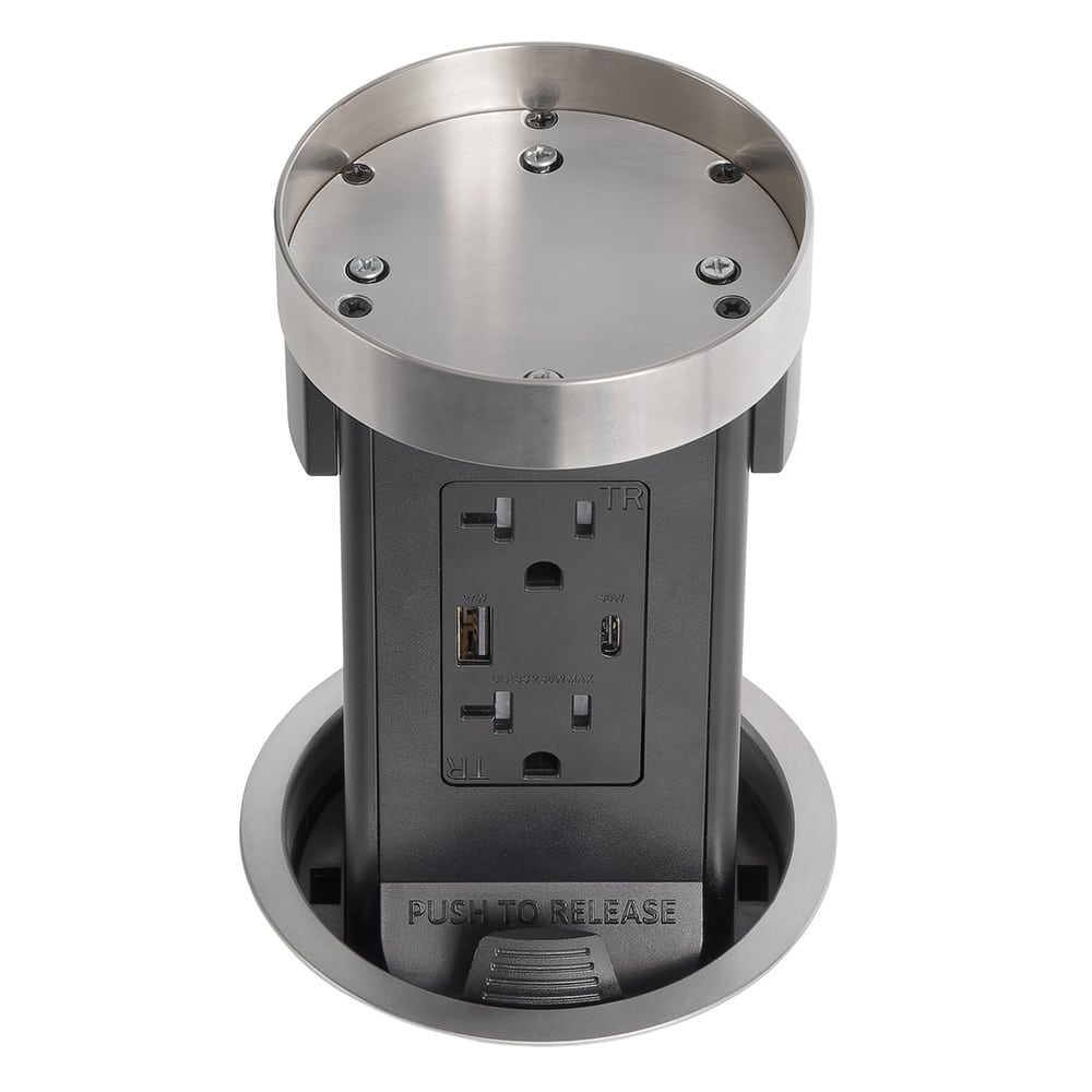 The Lew Electric PUR20ACFCMRD-SS round Kitchen Countertop Pop-Up assembly is a sleek and functional solution for bringing power access directly to your kitchen countertop or any other work surface The innovative design allows for the countertop cut out to serve as the cover of the unit, creating a nearly seamless look on the counter. Designed to remain hidden when not in use, this retractable in-counter power outlet features a press-and-pull design—simply press the top and lift to reveal the outlet station. The body of the unit, including the receptacle has a beautiful black finish and the trim ring is a stunning stainless steel.