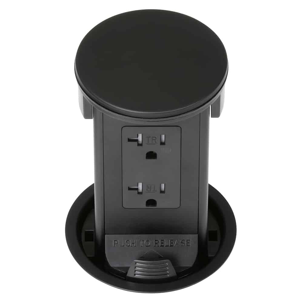 The Lew Electric PUR20DSD-BK round Kitchen Countertop Pop-Up assembly is a sleek and functional solution for bringing power access directly to your kitchen countertop or any other work surface. Designed to remain hidden when not in use, this retractable in-counter power outlet features a press-and-pull design—simply press the top and lift to reveal the outlet station. When not needed, the unit retracts and disappears completely beneath the counter, preserving a clean and clutter-free surface. The round top is constructed from real metal with a premium black finish, making it an ideal match for modern kitchens and bathrooms with black fixtures and hardware.
