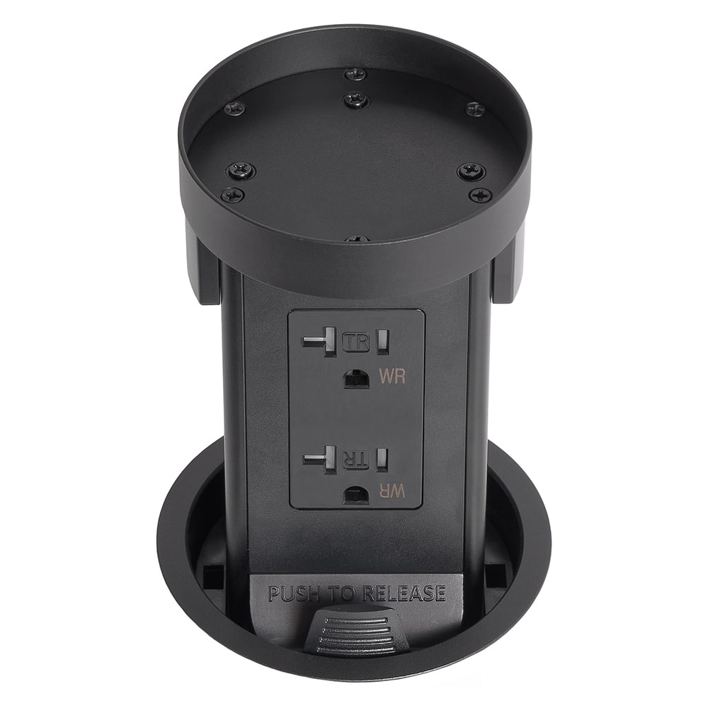 The Lew Electric PUR20DSFCMRD-BK round Kitchen Countertop Pop-Up assembly is a sleek and functional solution for bringing power access directly to your kitchen countertop or any other work surface. The innovative design allows for the countertop cut out to serve as the cover of the unit, creating a nearly seamless look on the counter. Designed to remain hidden when not in use, this retractable in-counter power outlet features a press-and-pull design—simply press the top and lift to reveal the outlet station. The body of the unit, including the receptacle has a beautiful black finish.