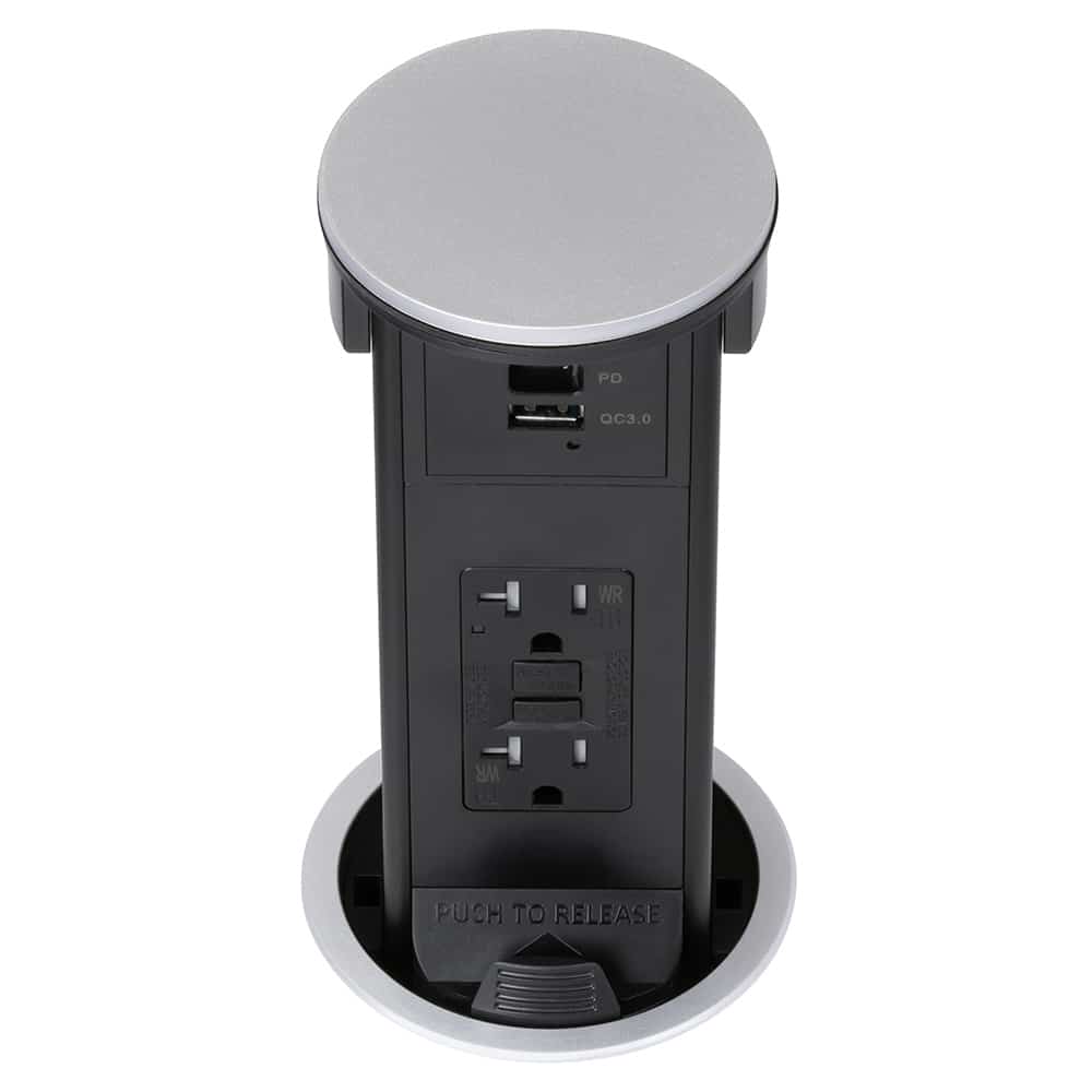 Whether you’re powering a blender, coffee maker, or warming tray, or charging up to four devices at once using the AC outlet and USB ports, this retractable pop-up outlet keeps your space functional and free of messy cords. It’s a perfect solution for kitchen islands, bars, workbenches, restaurants, hotels, and airports—anywhere clean, efficient access to power is needed.
