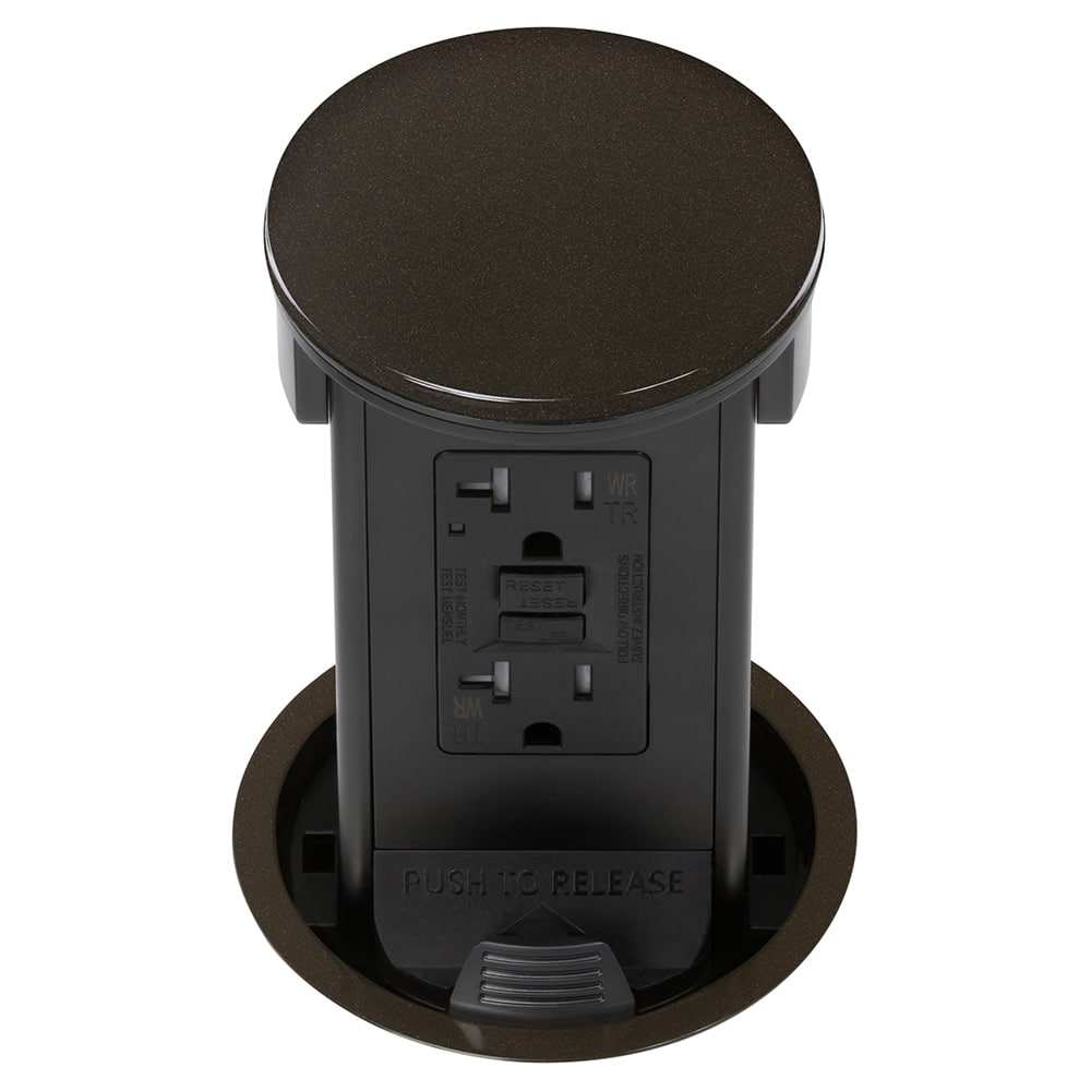 Round kitchen countertop pop-up power assembly with 20A (TR) GFCI outlet (receptacle) – dark bronze metal cover.