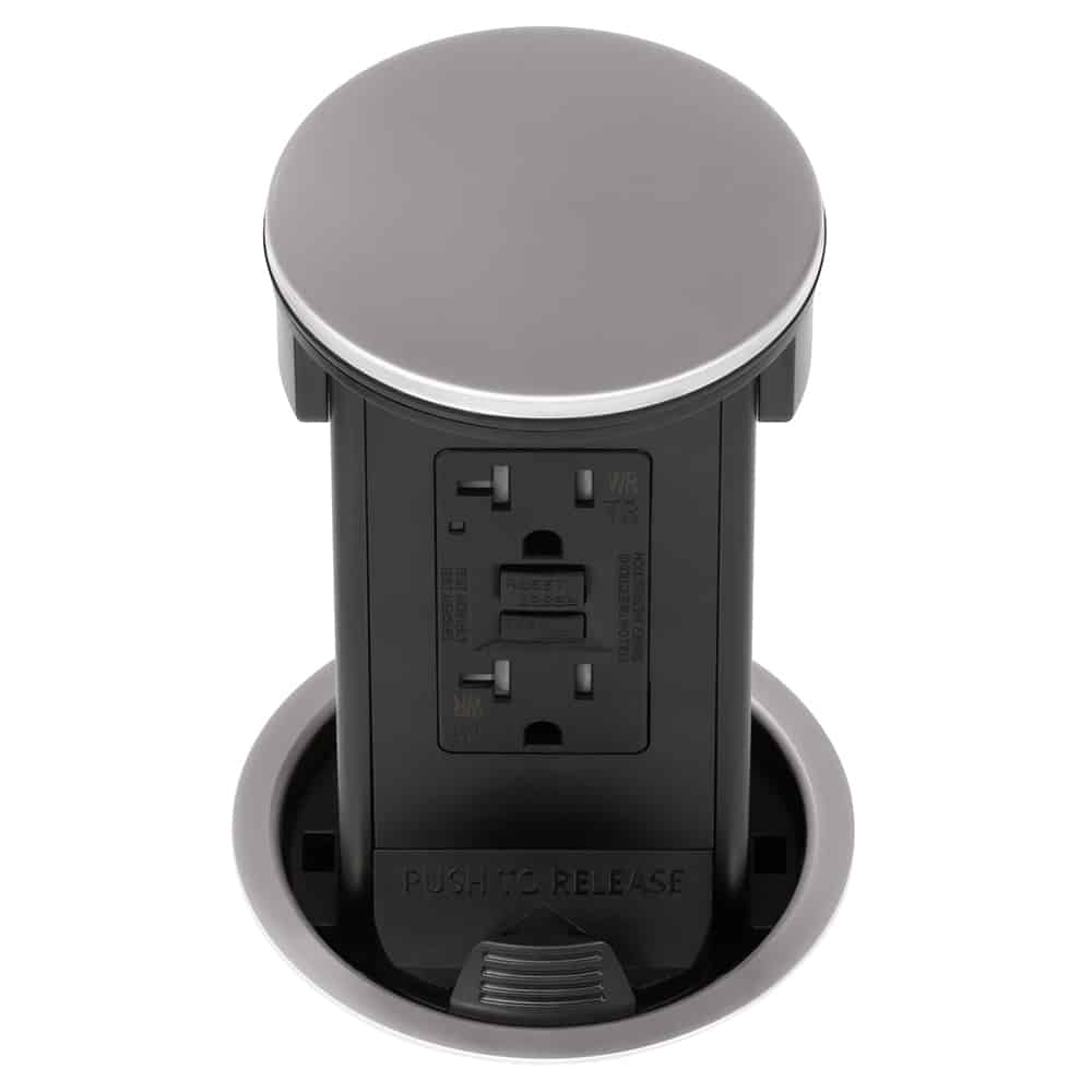 This pop-up power station includes a 20 AMP tamper-resistant (TR) outlet compatible with both 15 AMP and 20 AMP plugs, ensuring it can handle high-powered small kitchen appliances like blenders, coffee makers, toaster ovens, and warming trays without tripping the circuit.