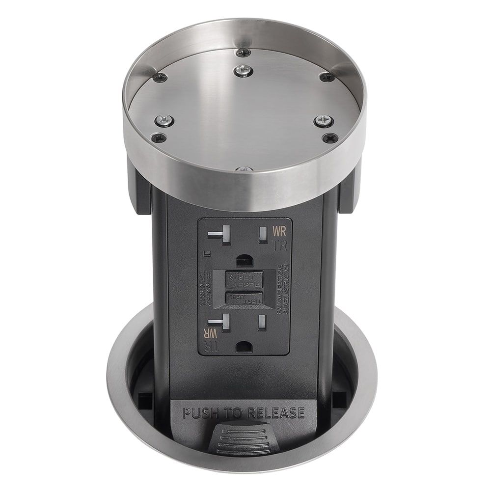 The Lew Electric PUR20GFCMRD-SS round Kitchen Countertop Pop-Up assembly is a sleek and functional solution for bringing power access directly to your kitchen countertop or any other work surface. The innovative design allows for the countertop cut out to serve as the cover of the unit, creating a nearly seamless look on the counter. Designed to remain hidden when not in use, this retractable in-counter power outlet features a press-and-pull design—simply press the top and lift to reveal the outlet station. The body of the unit, including the receptacle has a beautiful black finish and the trim ring is a stunning stainless steel.