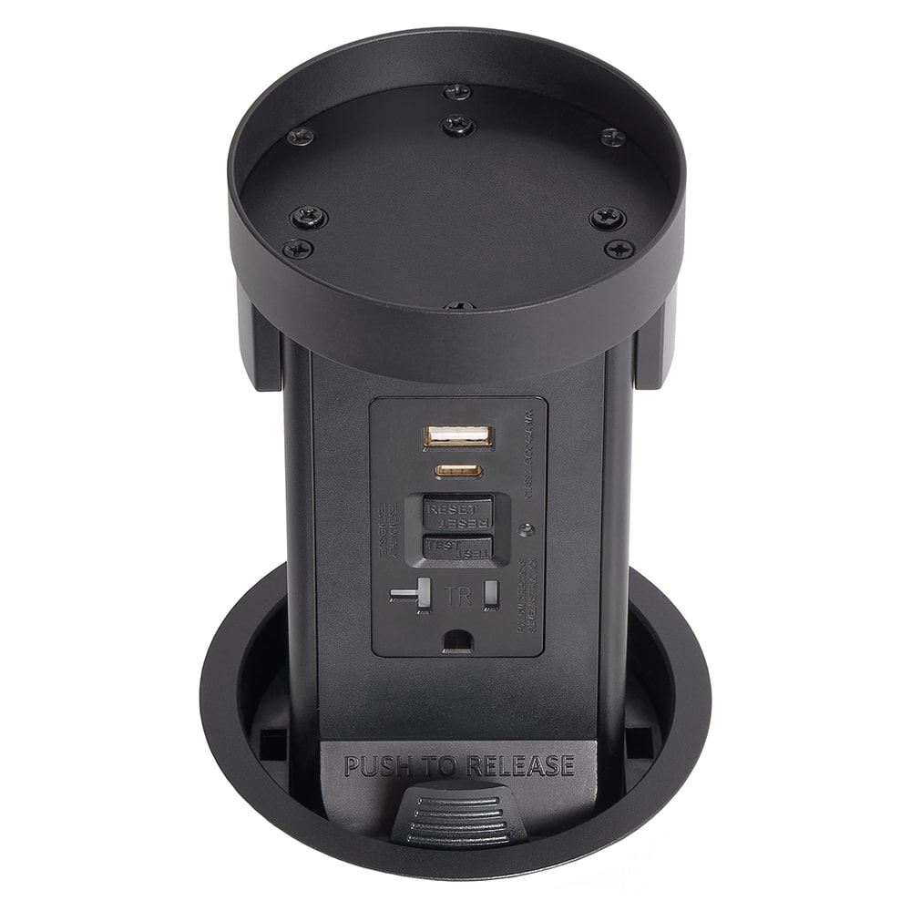 The Lew Electric PUR20GFIACFCMRD-BK Round Kitchen Countertop Pop-Up Assembly is a cutting-edge power and charging solution that combines premium design, modern functionality, and advanced safety features into a compact, retractable unit. Perfect for kitchens, workstations, bars, and commercial spaces, this in-counter outlet includes a built-in single 20A GFCI outlet with USB-A and USB-C fast charging ports. The innovative design allows for the countertop cut out to serve as the cover of the unit, creating a nearly seamless look on the counter. The body of the unit, including the receptacle has a beautiful black finish and blends in perfectly with dark colored countertops.