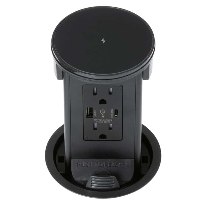 Wireless charging top, round kitchen countertop pop-up power assembly with