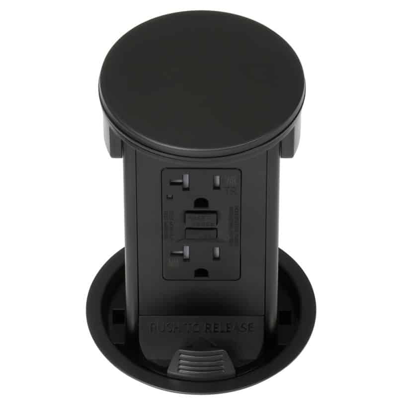 Kitchen counter pop-up power outlet assembly with 20A (TR) Decora/ 2USB (AC