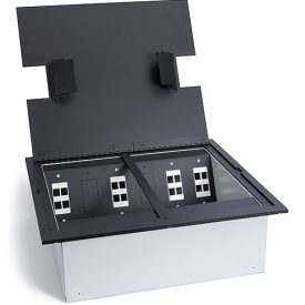 THE 12200 SERIES RECESSED/ACCESS BOX is a twelve-gang dual service floor box for use in a poured concrete floor, raised floor or wood floor. The box is constructed of 16 ga. galvanized steel and comes complete with heavy duty hot-rolled steel cover, in black or stainless steel. The units are shipped with disposable sheet metal covers to protect the box during concrete pour. The box is supplied with two (½ – ¾” combination) NPS conduit knockouts on the power side for conduit feed. The COMM/AV side has two (1 ½-2″ combination) NPS conduit knockouts. The unit comes complete with four adjustable legs for pre-pour adjustment. For raised floor or wood floor applications, disregard the adjustable leg hardware. All gangs are supplied with blank/decora knockout plates that accepts most decora receptacles, GFCI receptacles and low voltage yokes.
