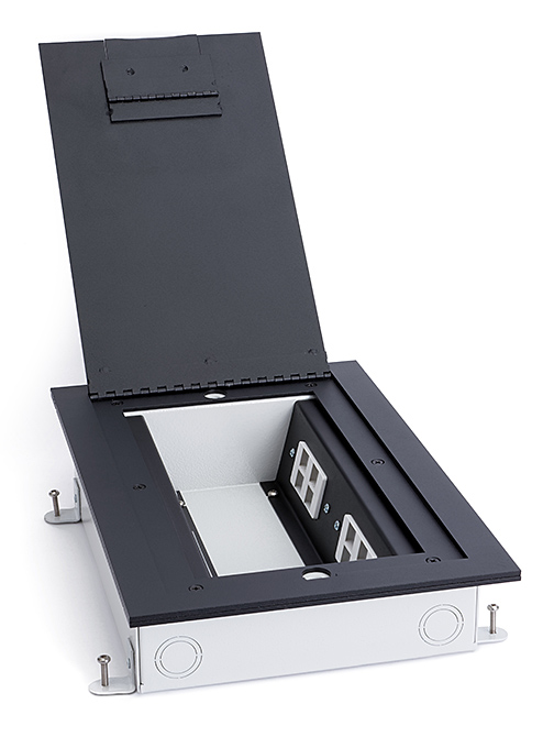 THE 4200 SERIES RECESSED/ACCESS BOX is a four-gang dual service floor box for use in a poured concrete floor, raised floor or wood floor. The box is constructed of 16 ga. galvanized steel and comes complete with heavy duty hot-rolled steel cover, in black or stainless steel. The units are shipped with disposable sheet metal covers to protect the box during concrete pour. The box is supplied with two (½ – ¾” combination) NPS conduit knockouts on each end for conduit feed and two (1 ½”) NPS conduit knockouts on the bottom COMM/AV side. The unit comes complete with four adjustable legs for pre-pour adjustment. For raised floor or wood floor applications, disregard the adjustable leg hardware. All gangs are supplied with blank/decora knockout plates that accepts most decora receptacles, GFCI receptacles and low voltage yokes.